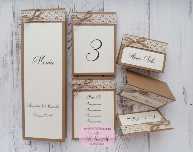 Meniu, numar masa, card asezare in stil rustic cu carton reciclat, dantela si sfoara 17/06/201829/02/2024