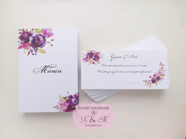Meniuri, plicuri bani, numere masa, lista invitati A3 pentru nunta cu flori mov si lila cod 139 25/08/201804/02/2025