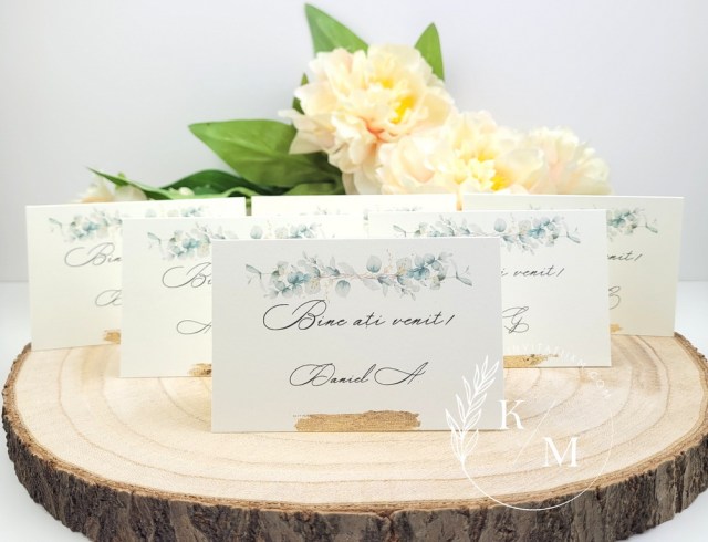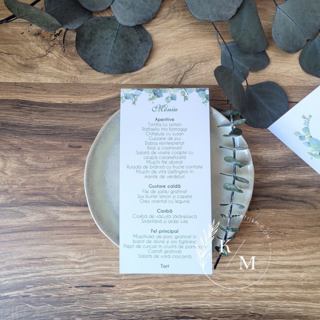 Invitatii, meniuri, numere masa, etichete marturii cu chenar si frunze de eucalipt cod 124 21/06/201804/02/2025