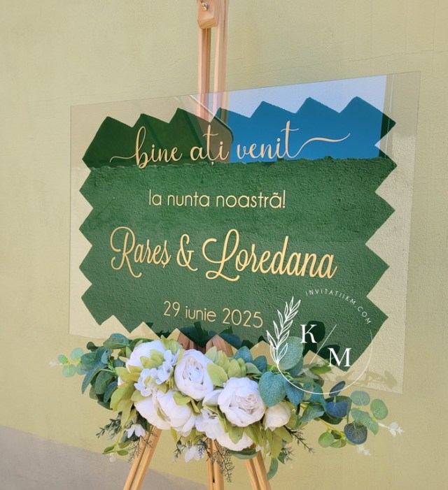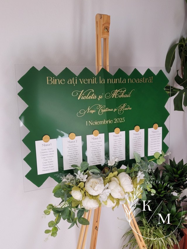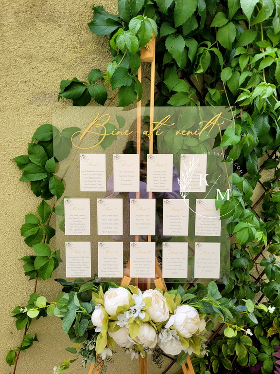 Panou cu liste asezare invitati la nunta, Liste asezare invitati la mese si panou din plexiglas verde si auriu 28/12/202311/03/2025