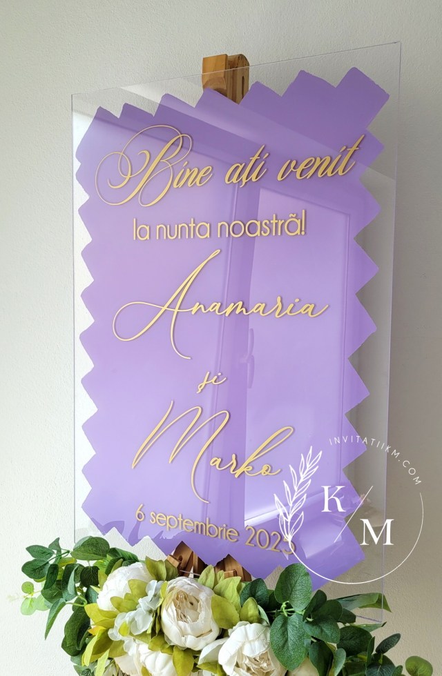 Panou bun venit/intampinare invitati la nunta lila si auriu, panou bine ati venit la nunta noastra 28/12/202305/12/2025
