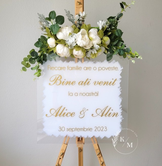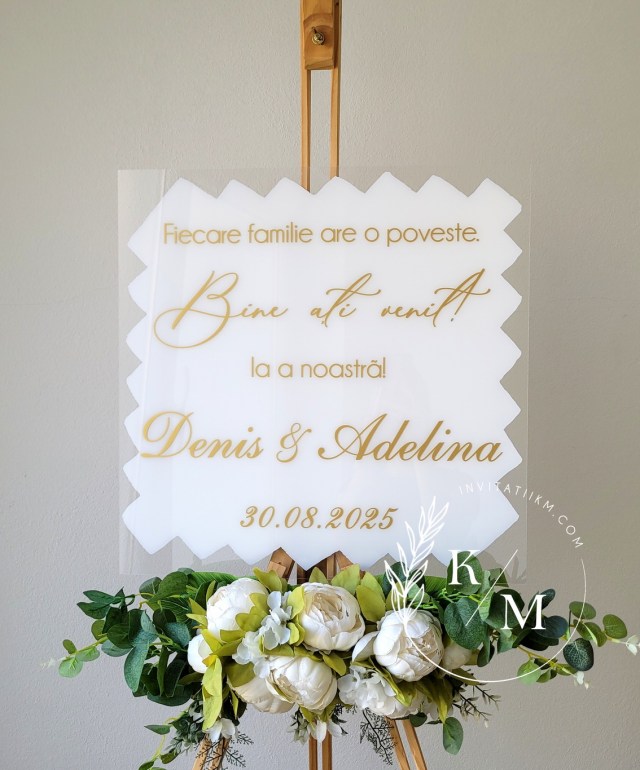 Fiecare Familie Are O Poveste, Panou intampinare nunta, panou bun venit la nunta alb si auriu 28/12/202314/04/2025