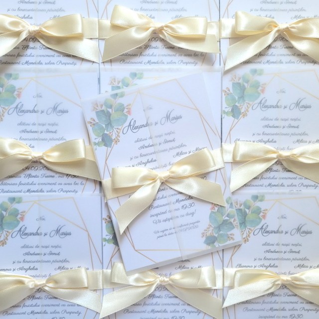 Invitatii de nunta cu chenar geometric, plic personalizat si frunze verzi, eucalipt cod 412 14/02/202003/02/2025