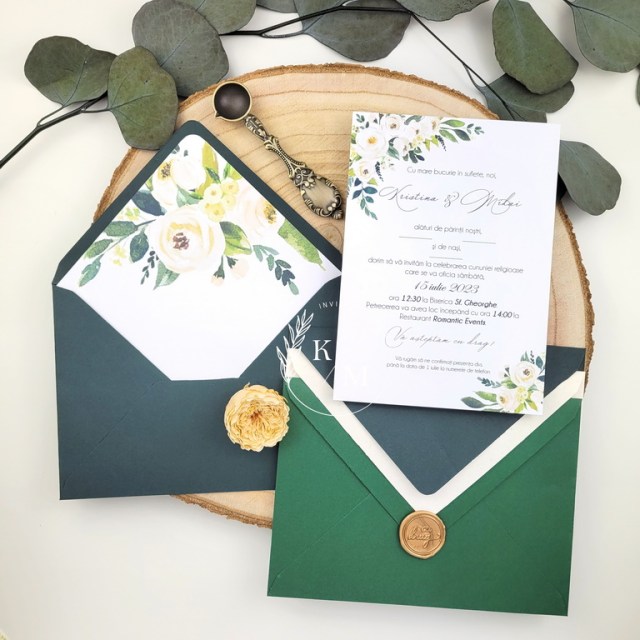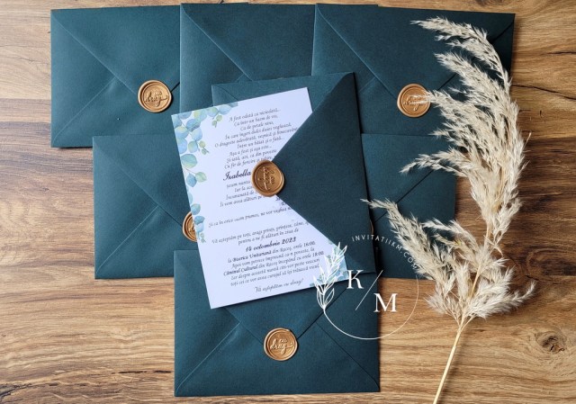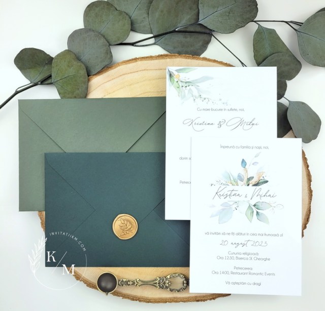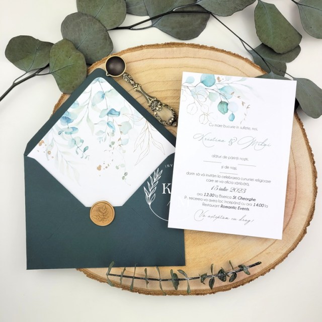 Invitatii de nunta greenery, cu verdeata, frunze de eucalipt si plicuri verzi cu sigilii 19/02/202303/02/2025
