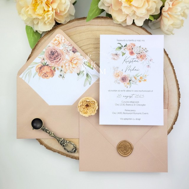 Invitatii de nunta cu flori in culori pamantii, blush, piersica, albe, portocalii 19/02/202303/02/2025