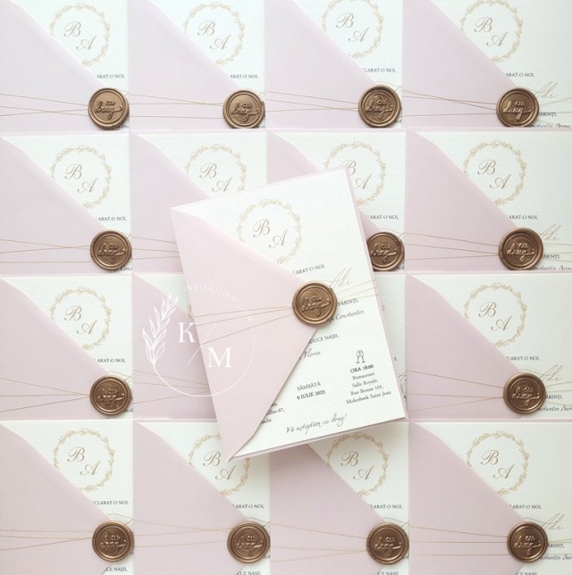 Invitatii de nunta elegante cu coronita aurie, plic roz blush, snur auriu si sigiliu “cu drag” 23/03/202328/01/2025